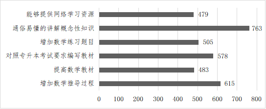 在调查学生对数学使用教材的改进意见时,增加数学推导过程、提高数学教材质量、对照专升本考试要求编写教材、增加数学练习题目、通俗易懂的讲解概念性知识、能够提供网络学习资源等改进建议均有超过40%的学生选择,见图11。可以看出学生需要的是一种可以辅助数学基础较差的学生能够进行自主学习的教材,需要满足学习、考试、复习、自学等多种用途。教材要适应当代学生喜欢网络学习的要求,配套完整的讲解视频资源。但当前市场上找不到这样的教材的,为满足学习需要,学院应当考虑自编教材。