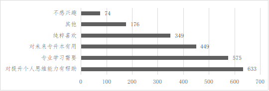 调查发现有91%的学生表示对数学有一定的兴趣,其中有43%的学生十分感兴趣。对数学感兴趣的主要原因有:可以提升个人思维能力(58%)、专业学习需要(53%)、对未来专升本有用(41%),具体见图4、图5。出于学生学习需求、专升本考试的外在要求、人才培养的实际需要等,学院都应当为学生开设数学课程,并且提高授课质量。