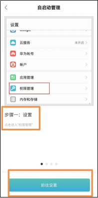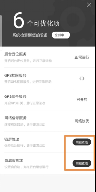 (3)设置手机:在弹出来的界面中点击“前往查看”,再根据图二所提示的步骤,点“前往设置”,设置好手机。(图一是软件根据手机型号自动提示的,不同型号手机要求的设置不同,如果没有黑色“前往查看”即不需要单独设置,可以跳过这一步)完成手机设置后返回跑步界面继续跑步。
