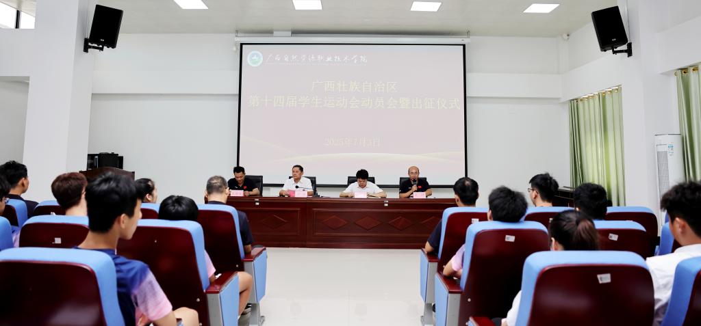 为全力备战2025年广西壮族自治区第十四届学生运动会,我校公共基础部于7月3日上午10时在学院行政楼501会议室举行出征大会。参加本次出征大会的领导有,学院党委副书记刘勇、公共基础部负责人汪元飞、体育组负责人王得有,以及体育组全体教师、各比赛项目教练员及全体参赛运动员。