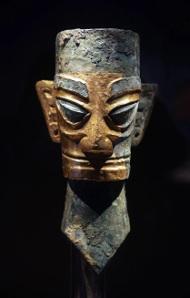 The character of a thick-browed beast, with its exaggerated eyebrows, is reminiscent of a bronze head with a gold mask and a bronze mask in the Sanxingdui Museum.