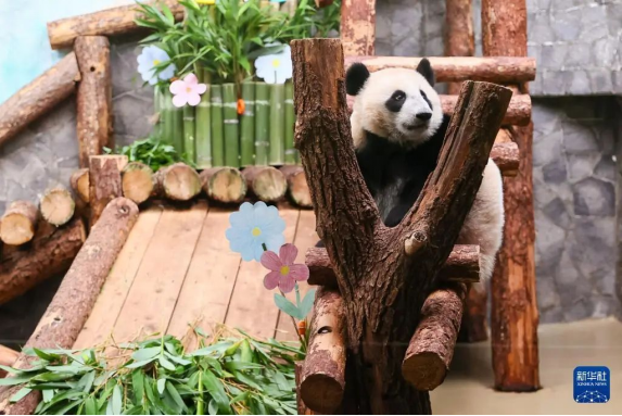 在俄罗斯莫斯科动物园,大熊猫“喀秋莎”在生日庆祝饰品旁玩耍。新华社记者 白雪骐 摄