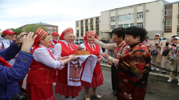 当地时间2024年5月22日,俄罗斯布拉戈维申斯克,黑河老年大学协会赴俄研学团学员接受俄罗斯最高礼仪,品尝面包和盐。图源:视觉中国
