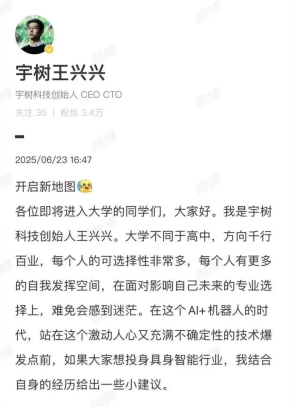 The founder of Unitree Robotics, Wang Xingxing, shared practical advice on Monday for soon-to-be university students on choosing their majors and navigating academic challenges.