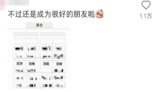 A student shared a humorous experience when the teacher called out, "Liu Yang, please answer this question," only to be met with silence. Since several classmates have names pronounced the same, extra characters were added to their names to tell them apart, resulting in humorous nicknames.