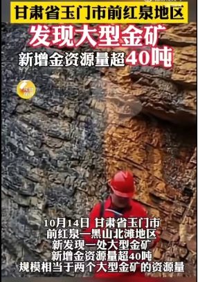 据甘肃省自然资源厅周三消息,甘肃省玉门市新发现一处大型金矿,新增金资源量超40吨,规模相当于两个大型金矿的资源量。