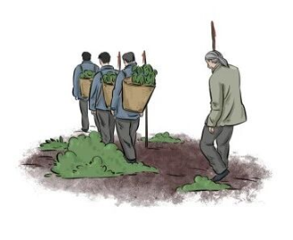 Kanzhaotou/Making a Sign: Gatherers mark a symbol at the spot to commemorate the find and guide future seekers. Xiashan/Descending the Mountain: After the collection is complete, the team leaves the forest with the harvested ginseng.
